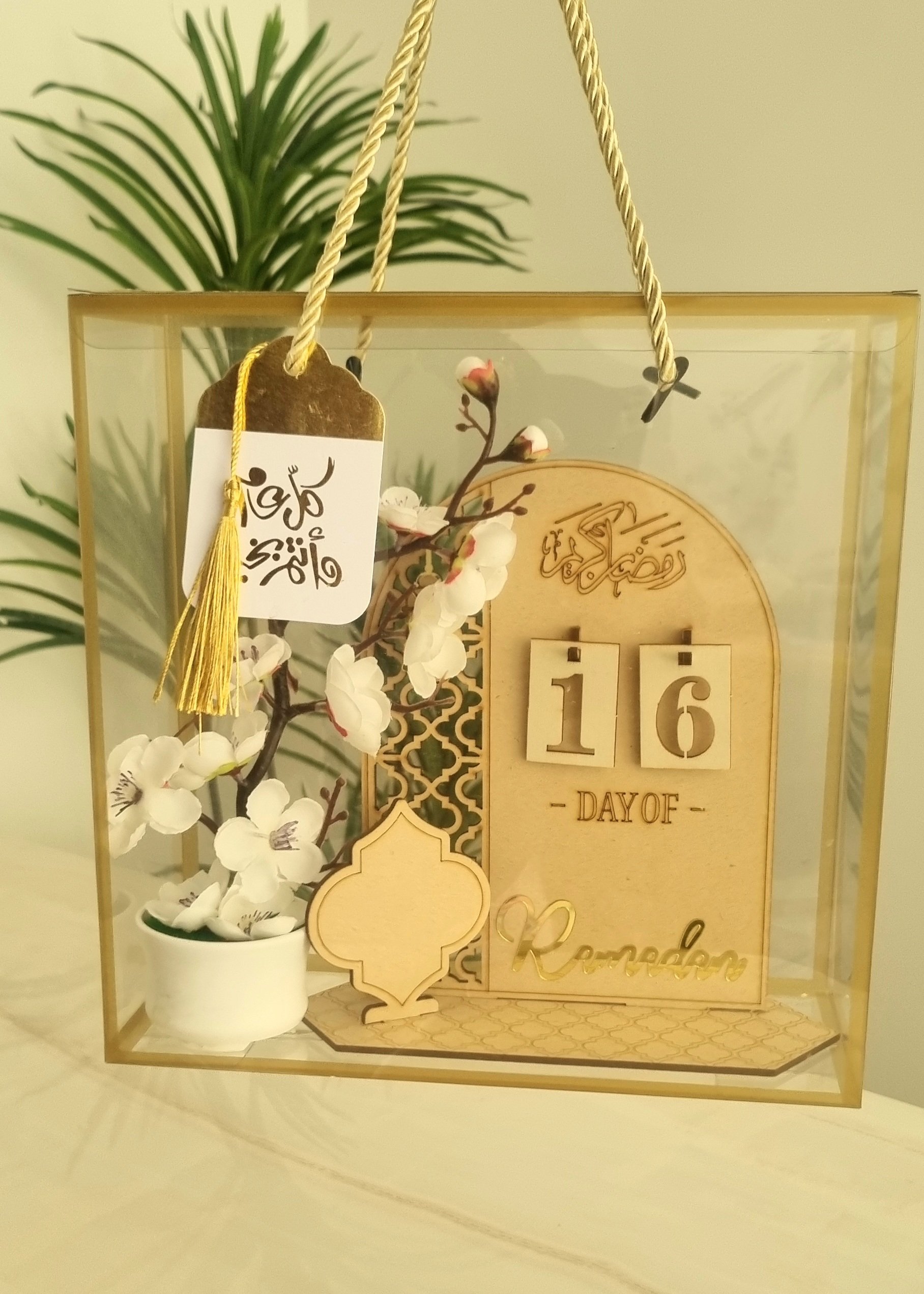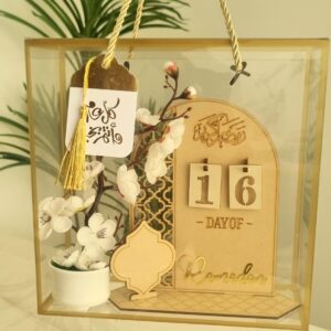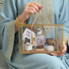 صينية خشبية مع إبريق شاي زحاجي، عدد ٦ أكواب زجاجية، علبة مكسرات، علبة تمر و مزهرية مع كيس وبطاقة بالاسم