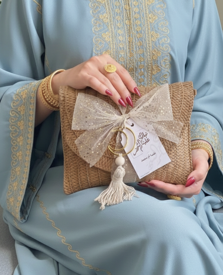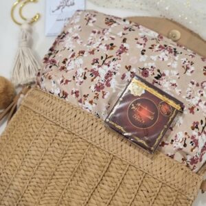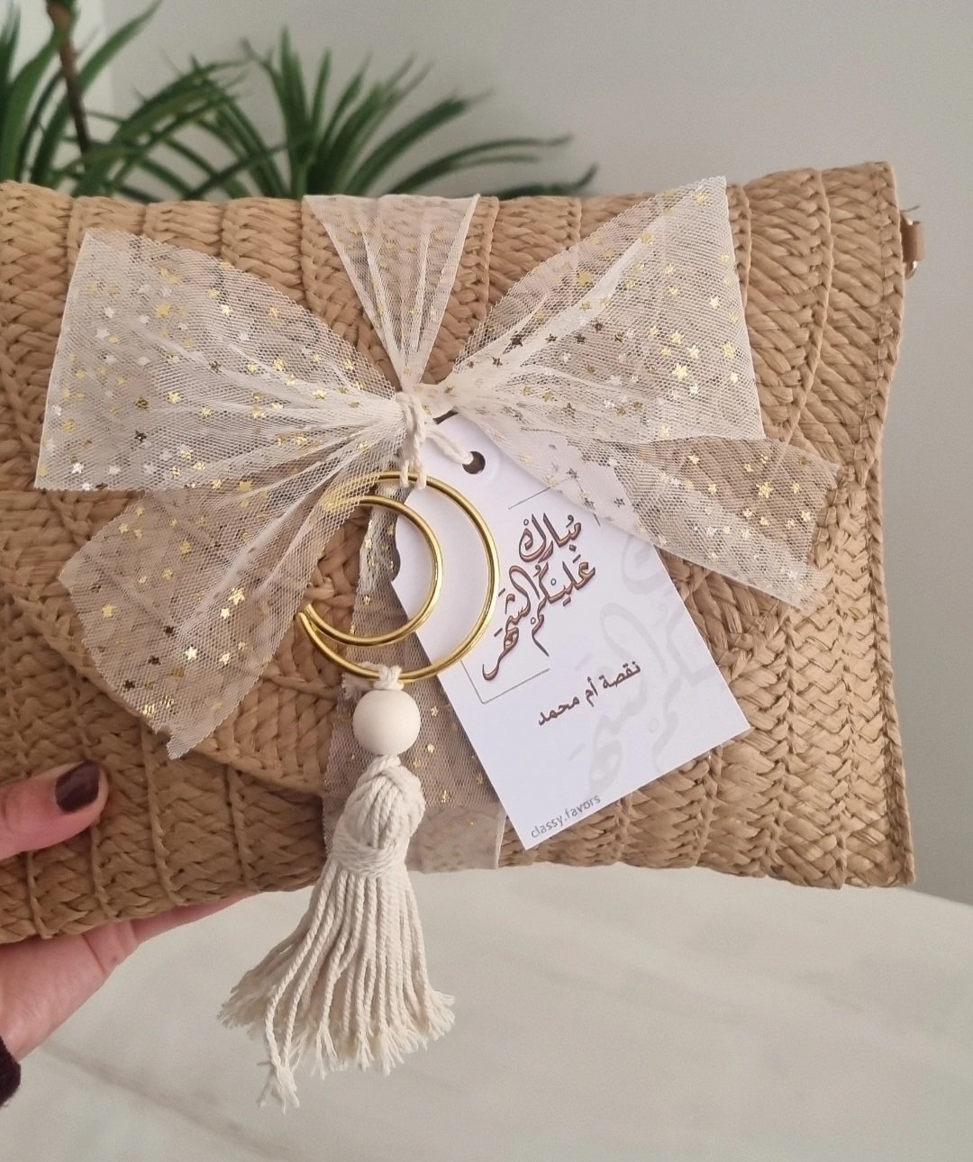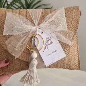 حافظة طعام من الخوص تحتوي على تمر صقعي في اناء زجاجي شامل البطاقة و تعليقة مميزة على شكل نخلة