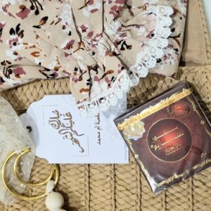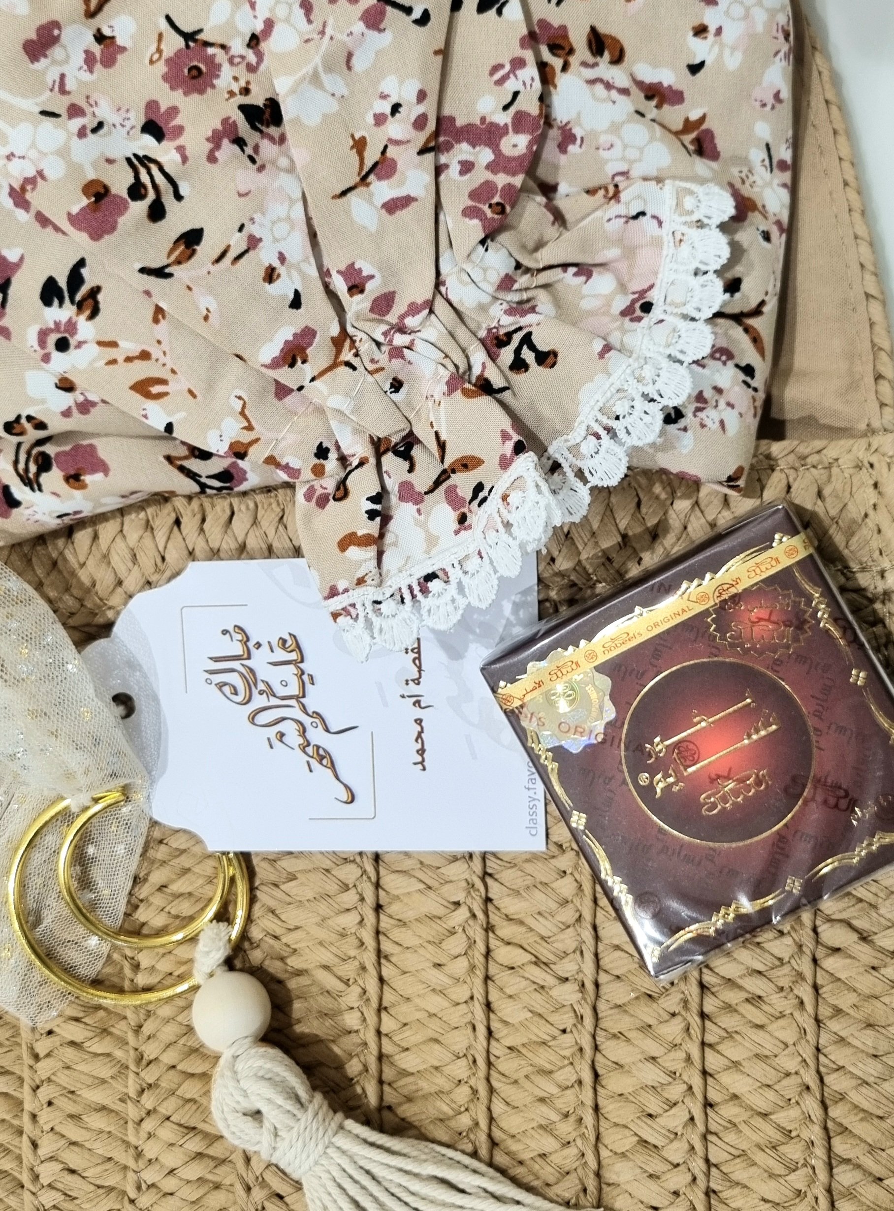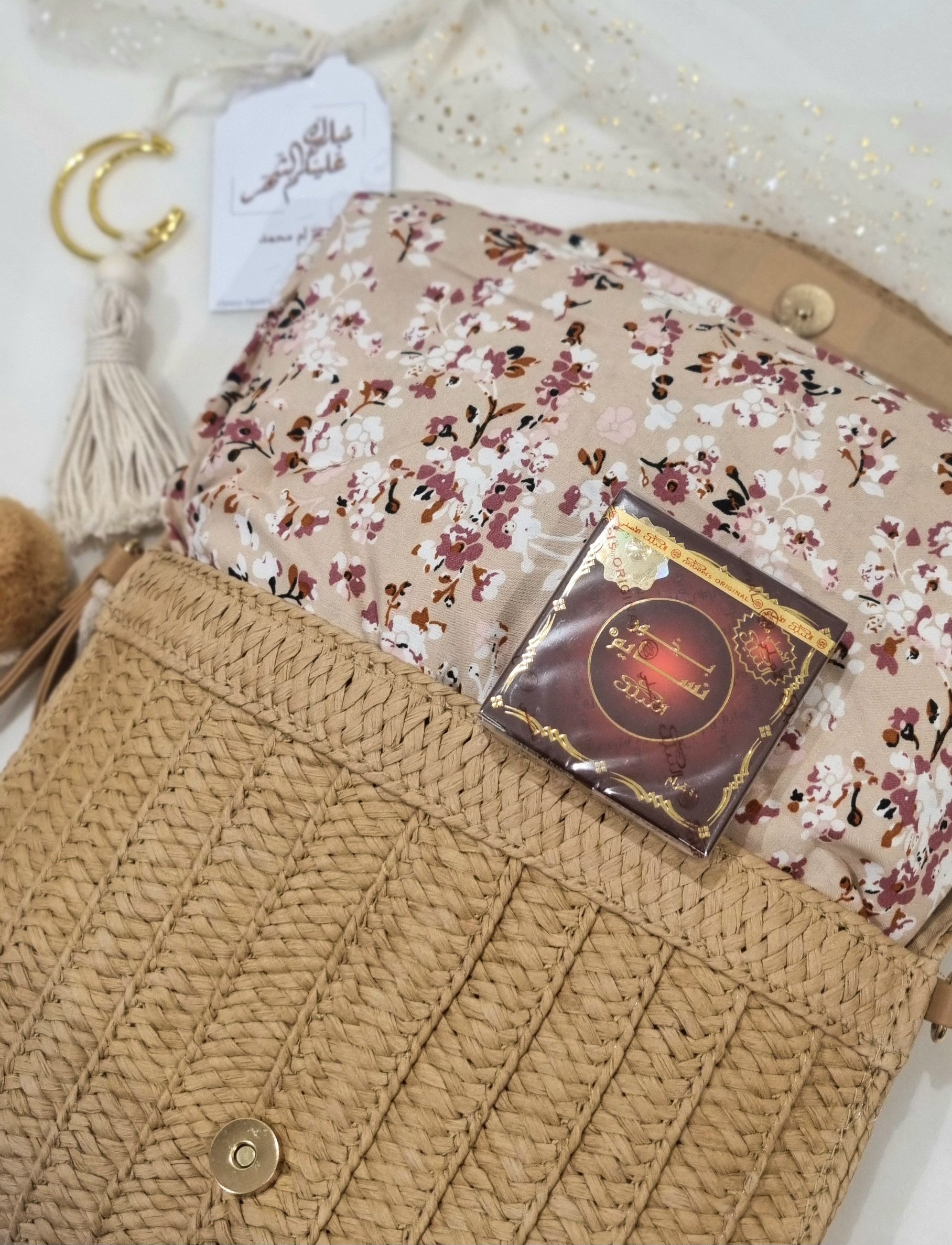 نقصة المبخر صينية خشبية مع مبخر خشبي، كسرة عود و ورد في علبة مع البطاقة